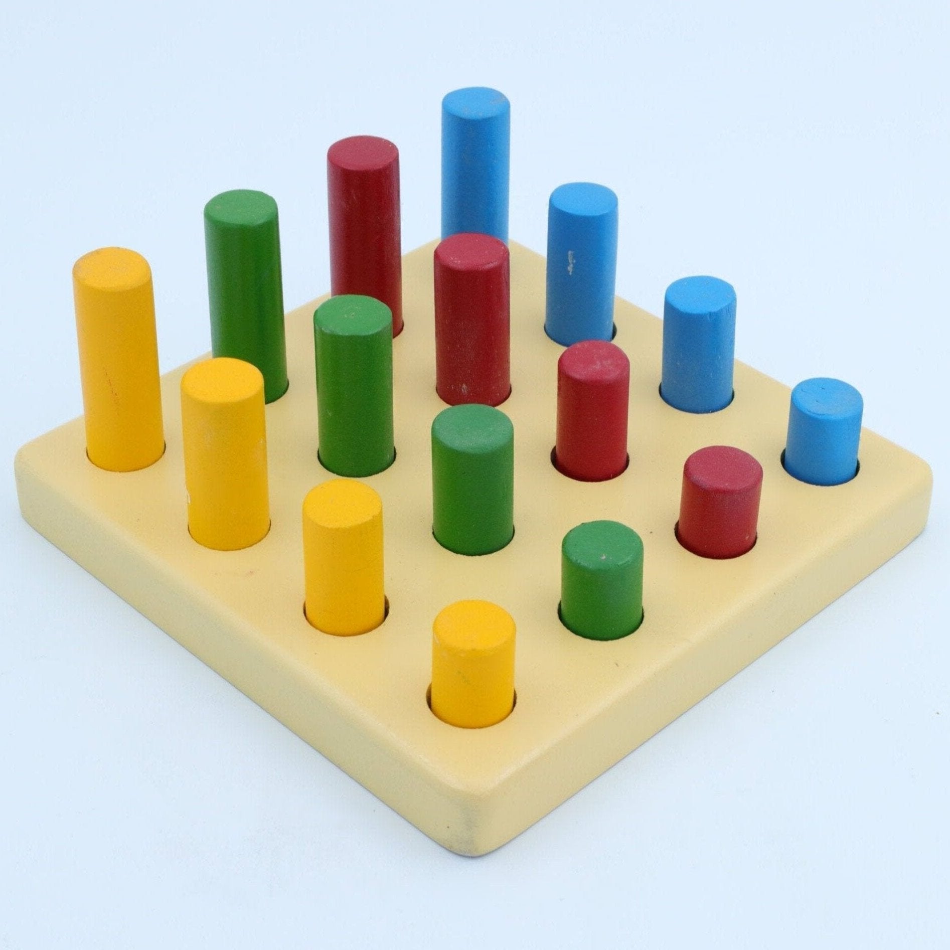 • By fitting each piece into the cavity in the base and arranging into rows of ascending height, children learn to distinguish size, seriation and colour gradation.